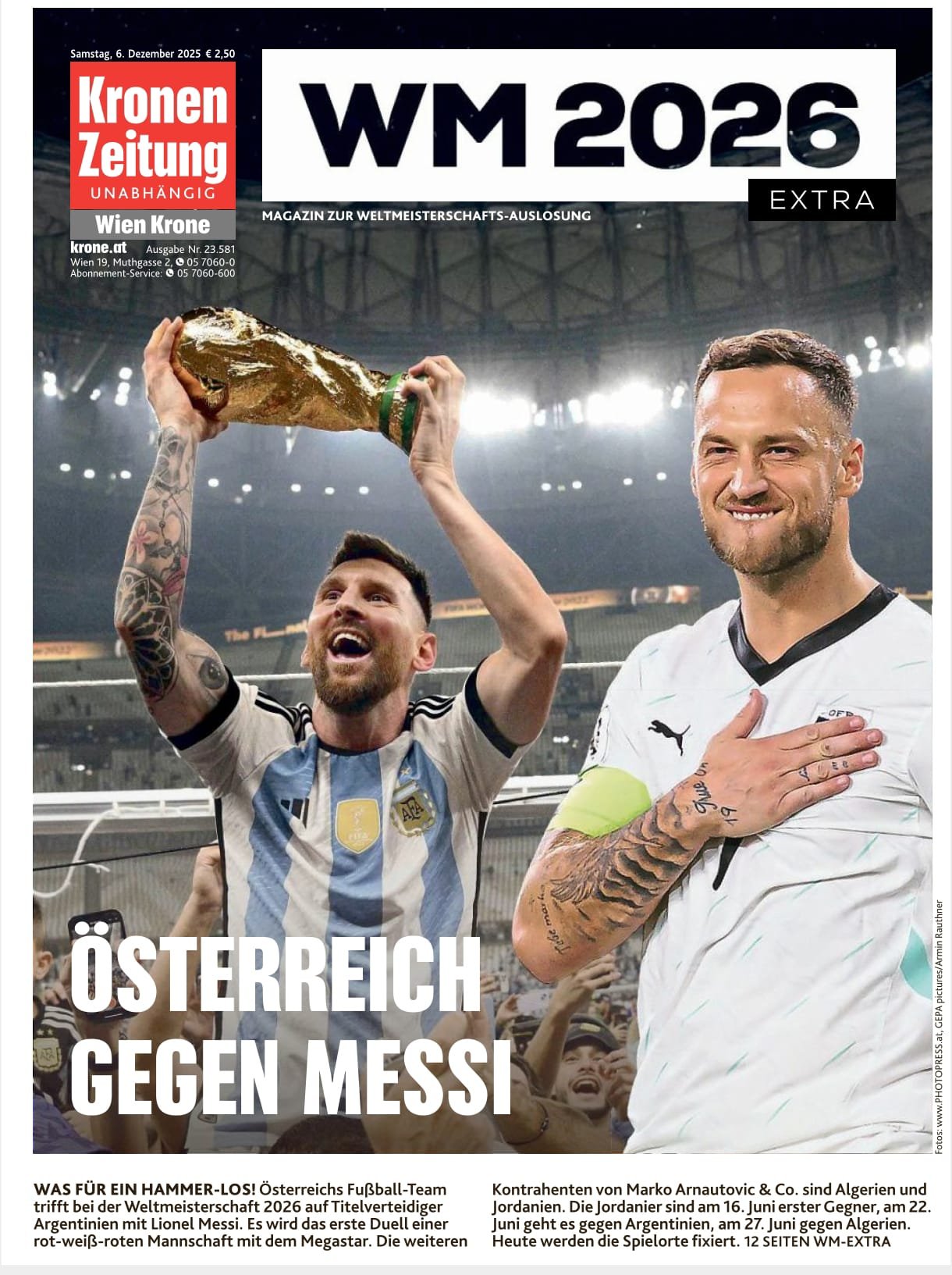 El sorteo capturó la atención de los medios austríacos y renovó la euforia futbolística que acompaña cada gran torneo. El periódico de mayor tirada e influencia en el país, Kronen Zeitung —leído por uno de cada dos austríacos—, dedicó 12 páginas al evento y tituló su cobertura principal: “Austria contra Messi”.